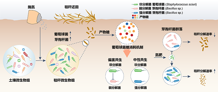 研究发现,施氮在秸秆分解前期塑造了以芽孢杆菌和富营养型非分解菌(以葡萄球菌为主)为核心的微生物群落。有趣的是,虽然葡萄球菌不具备分解能力,但它通过糖类养分竞争机制,诱导秸秆分解者群落中具有强分解能力的芽孢杆菌比例不断增加,并维持其高效降解能力,将施氮条件下秸秆分解速率提高17%。研究揭示了传统研究中被忽视的富营养型非分解菌在土壤碳循环中的重要作用,为进一步提高秸秆还田效率,助力农业绿色发展和“双碳”目标实现提供了理论参考。